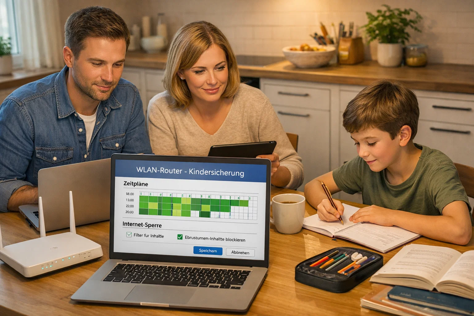 Eltern richten die Kontrolle des WLAN Routers für Schule und Kinder ein, um Internetzeiten und Inhalte sicher zu steuern.Anleitung für Eltern Kontrolle des WLAN Routers Schule – einfach erklärt