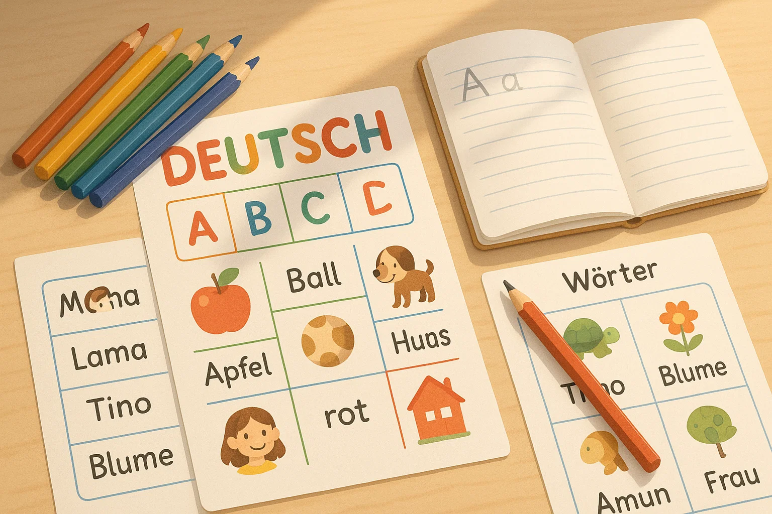 Anfänger üben Deutsch mit bunten Arbeitsblättern am TischDeutsch zu lernen kann am Anfang überwältigend wirken. Neue Wörter, komplizierte Grammatik und eine Aussprache, die nicht immer so klingt wie geschrieben. Viele Anfänger fragen sich: „Wie kann ich Deutsch schneller lernen?“ oder „Was ist als Erstes wichtig, wenn ich mit Deutsch anfange?“.